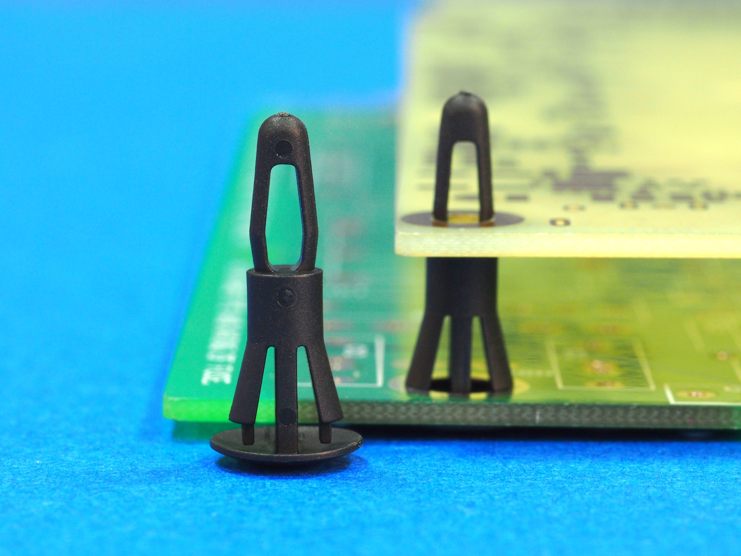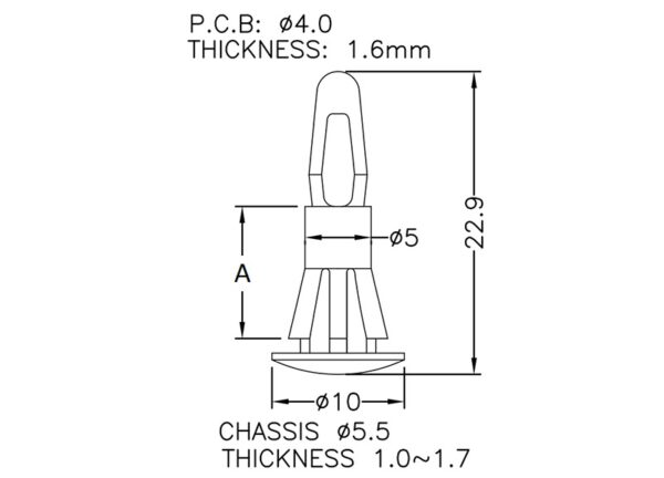 Reverse mount PCB spacer. Cupped design minimizes dust ingress and protrusion on chassis bottom. Bayonet snap fit for panel hole of 4 mm. Snap in fixation for chassis hole diameter of 5.5 mm. Spacer length 10 mm.