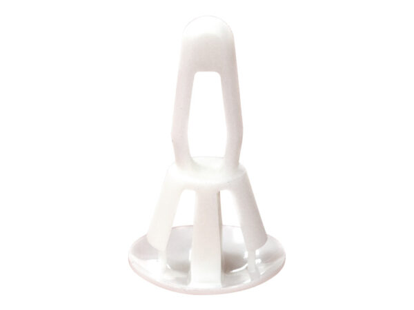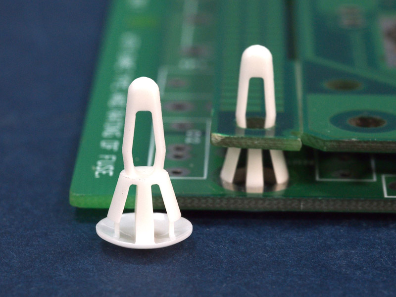Reverse mount PCB spacer. Cupped design minimizes dust ingress and protrusion on chassis bottom. Bayonet snap fit for panel hole of 4 mm. Snap in fixation for chassis hole diameter of 6 mm. Standoff height 4.8 mm.