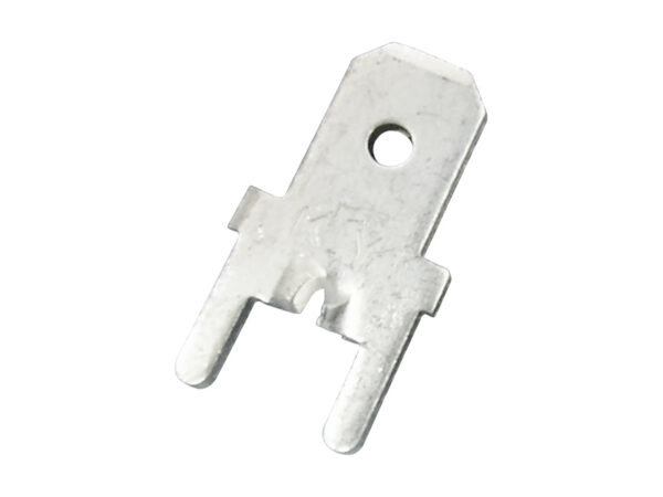 Straight Through Hole Solder Spade Terminal. Pitch 5.0mm. Tin Plated Brass. Current Rating 15 Amps. Tab size 4.8×0.5mm (.187″). The Sturdi Mount Design keeps the terminal upright on the PCB and adds additional strenght during terminal mating