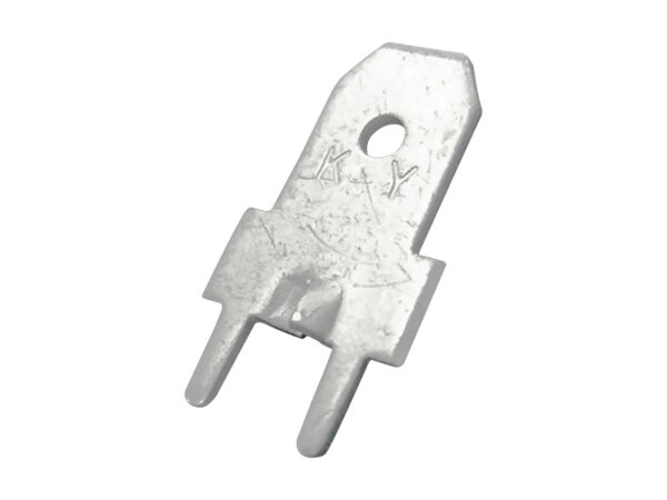Straight Through Hole Solder Spade Terminal. Pitch 5.0mm. Tin Plated Brass. Current Rating 15 Amps. Tab size 6.3×0.8mm (.250″). The Sturdi Mount Design keeps the terminal upright on the PCB and adds additional strenght during terminal mating