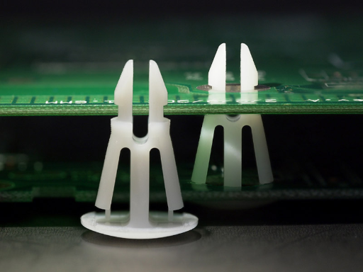 Reverse mount PCB spacer. Cupped design minimizes dust ingress and protrusion on chassis bottom. Arrowhead fits panel hole of 4 mm. Snap in fixation for chassis hole diameter of 5.5 mm. Standoff height 35.5 mm.