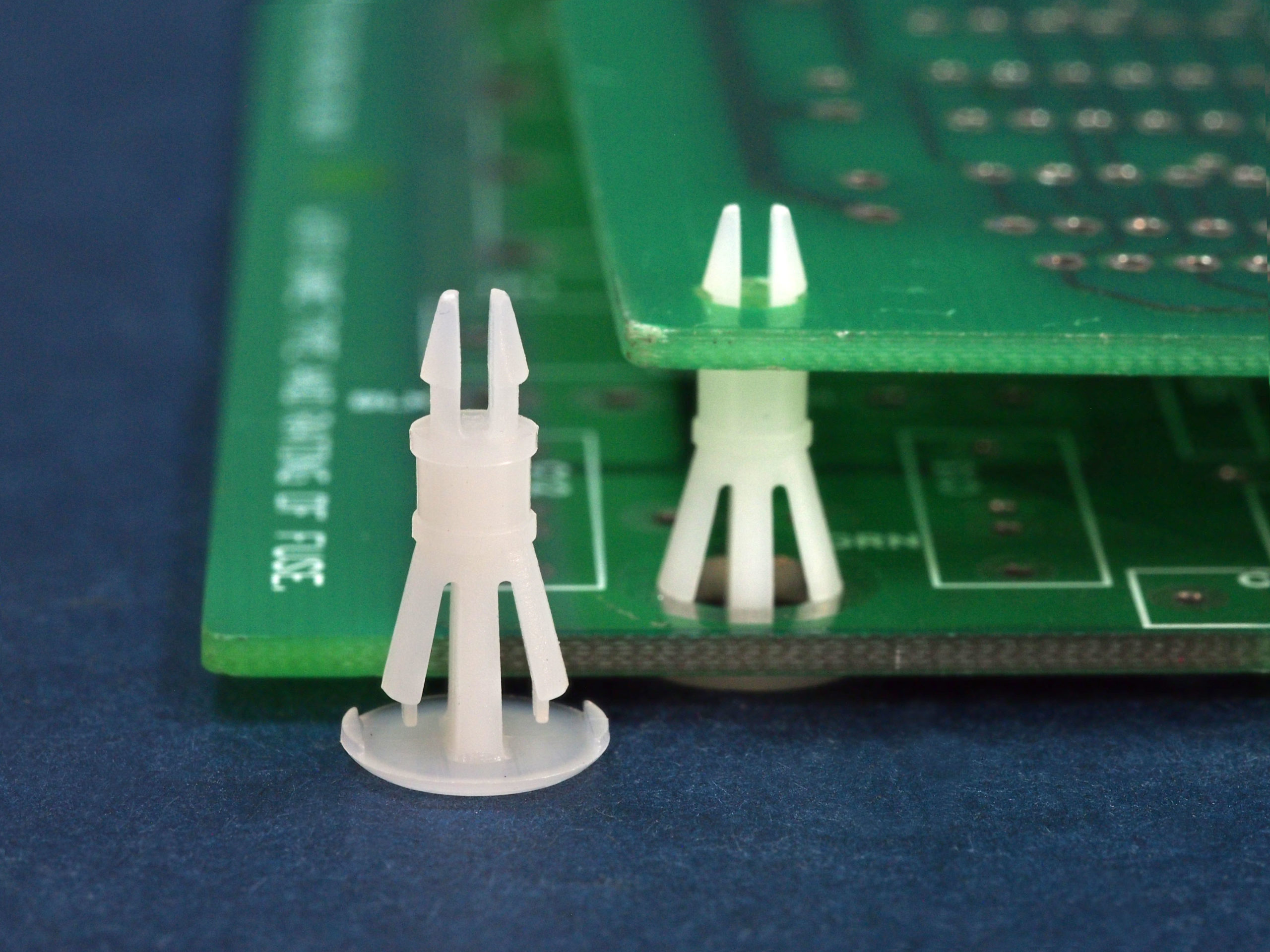 Reverse mount PCB spacer. Flat design minimizes protrusion on chassis bottom. Arrowhead fits panel hole of 3.2 mm. Snap in fixation for chassis hole diameter of 4.8 mm. Spacer length 6.5 mm.