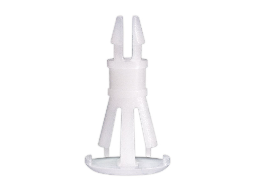 Reverse mount PCB spacer. Flat design minimizes protrusion on chassis bottom. Arrowhead fits panel hole of 3.2 mm. Snap in fixation for chassis hole diameter of 4.8 mm. Standoff height 9.5 mm.