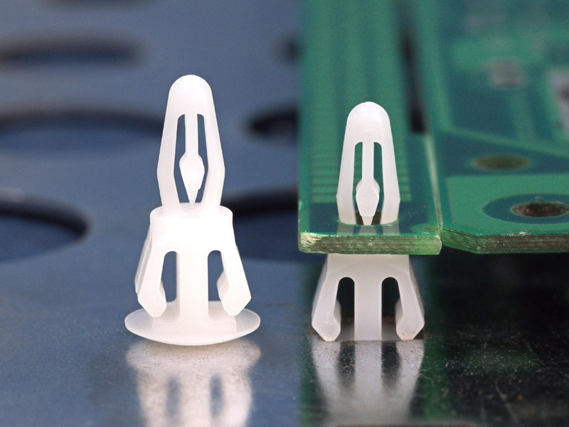 Reverse mount PCB spacer. Cupped design minimizes dust ingress and protrusion on chassis bottom. Bayonet snap fit for panel hole of 4 mm. Snap in fixation for chassis hole diameter of 6.3 mm. Standoff height 7 mm.