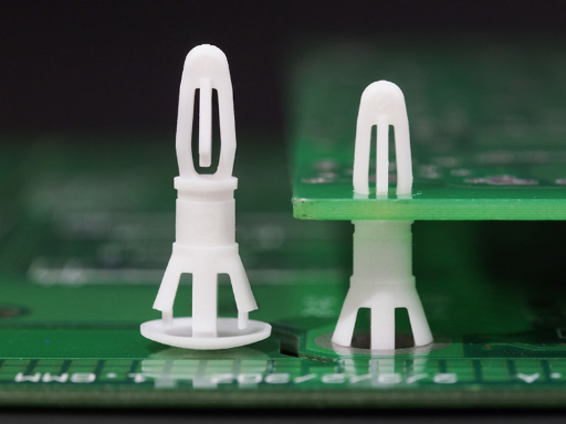 Reverse mount PCB spacer. Cupped design minimizes dust ingress and protrusion on chassis bottom. Bayonet snap fit for panel hole of 4 mm. Snap in fixation for chassis hole diameter of 6 mm. Standoff height 12.7 mm.