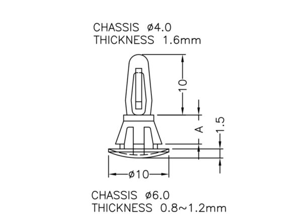 Reverse mount PCB spacer. Cupped design minimizes dust ingress and protrusion on chassis bottom. Bayonet snap fit for panel hole of 4 mm. Snap in fixation for chassis hole diameter of 6 mm. Spacer length 4.8 mm.