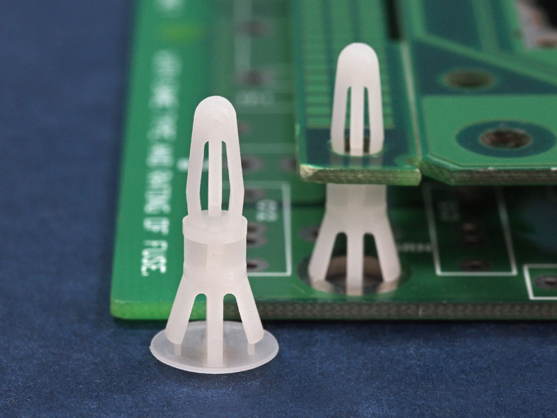 Reverse mount PCB spacer. Cupped design minimizes dust ingress and protrusion on chassis bottom. Bayonet snap fit for panel hole of 4 mm. Snap in fixation for chassis hole diameter of 6 mm. Standoff height 4.8 mm.