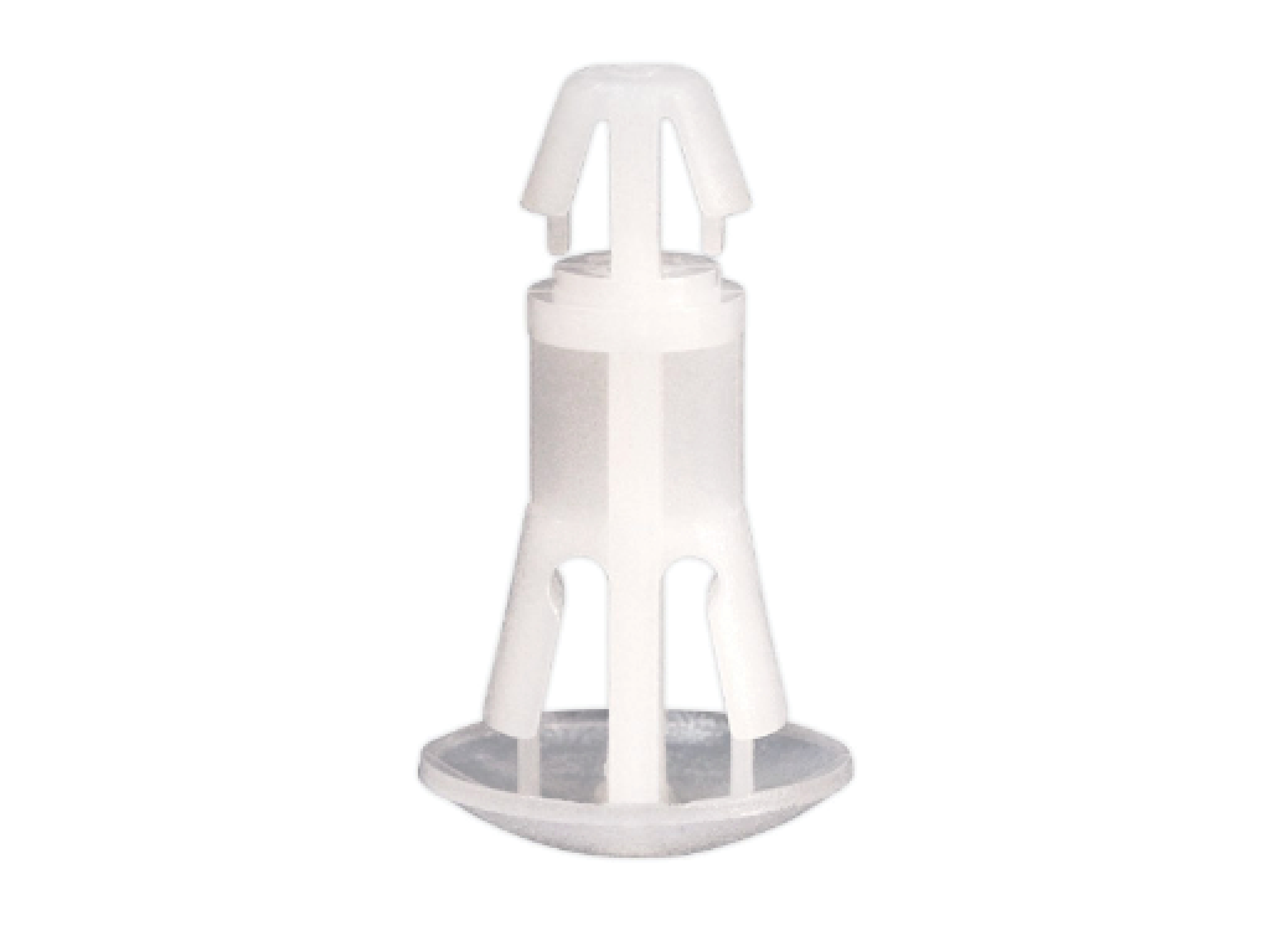 Reverse mount PCB spacer. Cupped design minimizes dust ingress and protrusion on chassis bottom. Arrowhead fits panel hole of 4 mm. Snap in fixation for chassis hole diameter of 5.5 mm. Standoff height 19 mm.