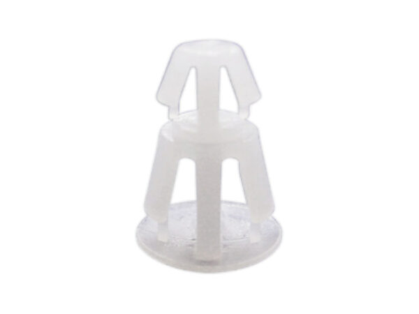 Reverse mount PCB spacer. Cupped design minimizes dust ingress and protrusion on chassis bottom. Arrowhead fits panel hole of 4 mm. Snap in fixation for chassis hole diameter of 5.5 mm. Standoff height 5 mm.