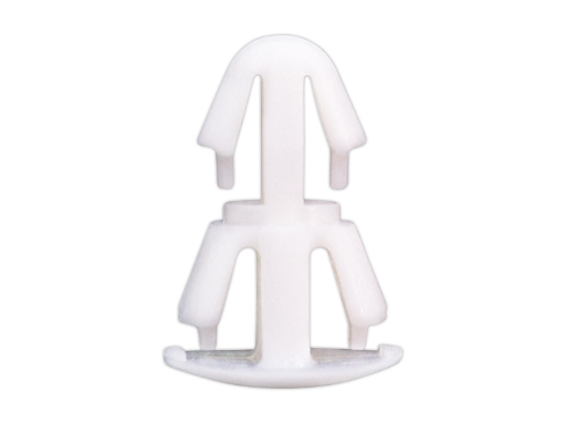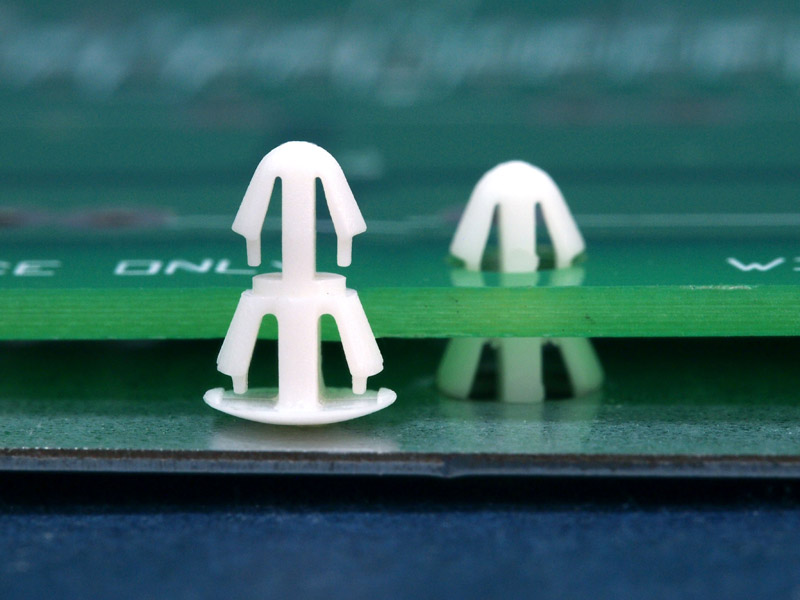 Reverse mount PCB spacer. Design minimizes protrusion on chassis bottom. Arrowhead fits panel hole of 3 mm. Snap in fixation for chassis hole diameter of 4 mm. Standoff height 2.5 mm.