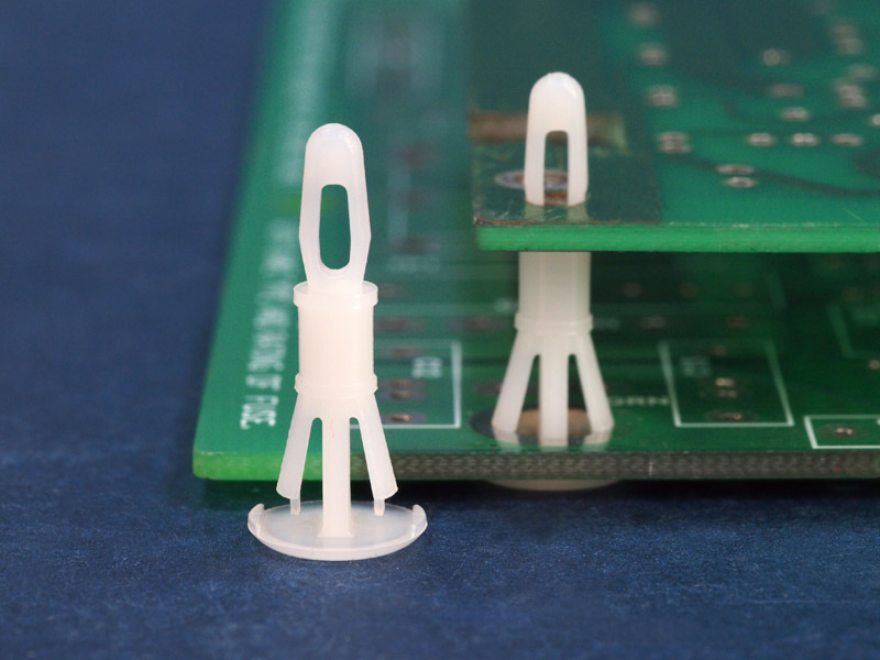 Reverse mount PCB spacer. Flat design minimizes protrusion on chassis bottom. Bayonet snap fit for panel hole of 3.2 mm. Snap in fixation for chassis hole diameter of 4.8 mm. Standoff height 11.1 mm.