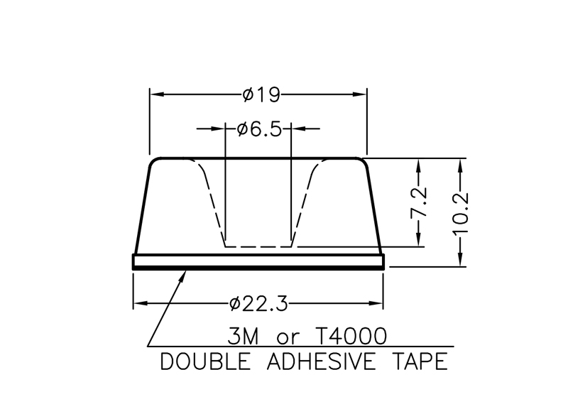 Recessed Self-Adhesive Rubber Bumper Ø22.3×10.2mm. The central cavity adds strength for high-impact use and allows for permanent attachment with nails or staples. These bumpers are often used on music equipment