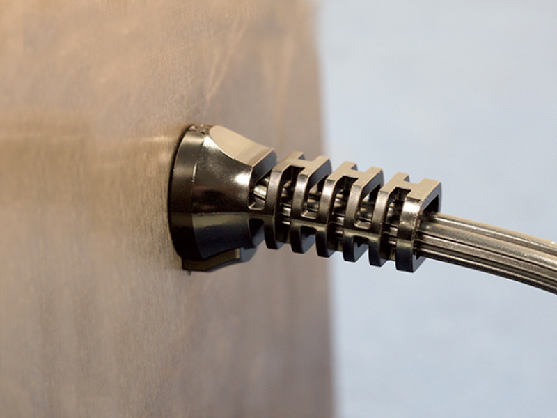 Strain Relief Bushing for Flat shaped cable. Material Nylon 6/6 Black. For cable size 4.6×8.0. Panel Thickness 0.8-2.3mm. Hole Size (WxH)13.2×14.3mm. Integral spring guides cable gently, preventing sharp bends. UL recognized.