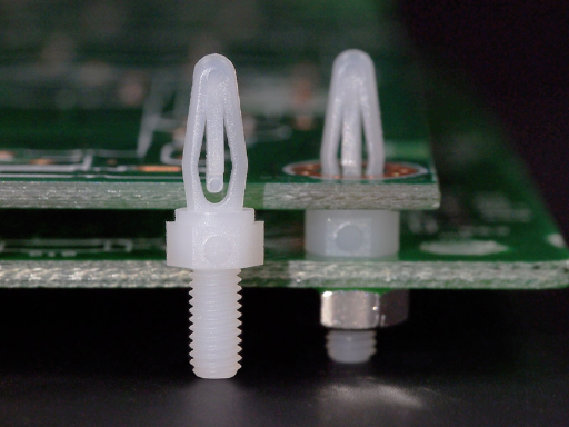 Metric Male Threaded M3 Hex Nylon 66 Bayonet Snap Lock spacer. Designed to fit a Metric M3 Chassishole. Top hole dia. Ø3.2mm. Thickness 1.6mm. Standoff height is 12.7mm