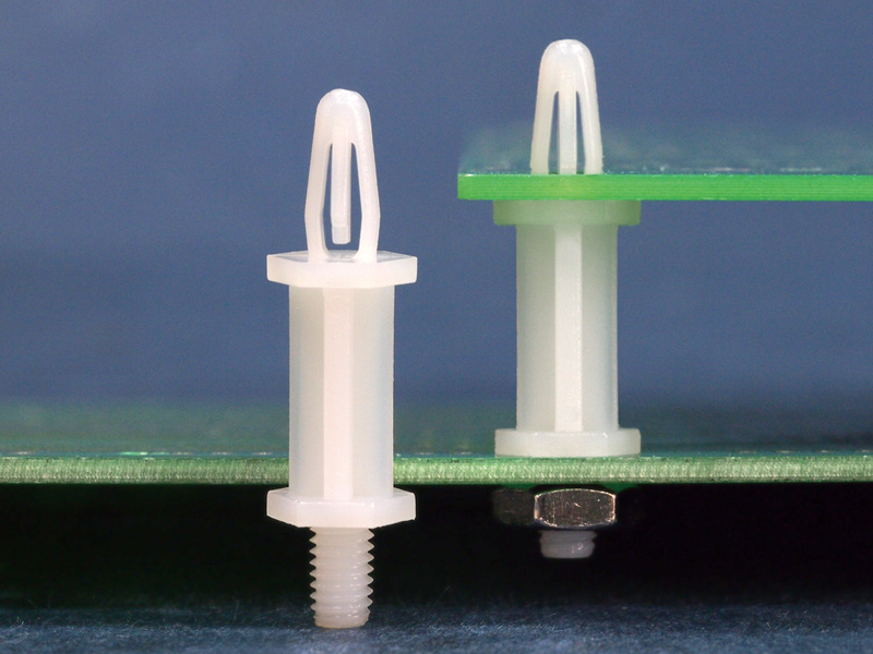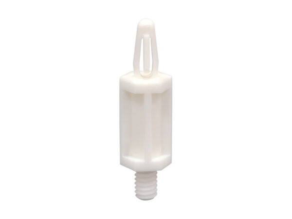 Metric Male Threaded M4 Hex Nylon 66 Bayonet Snap Lock spacer. Designed to fit a Metric M4 Chassishole. Top hole dia. Ø4.0mm. Thickness 1.6mm. Standoff height is 30.0mm