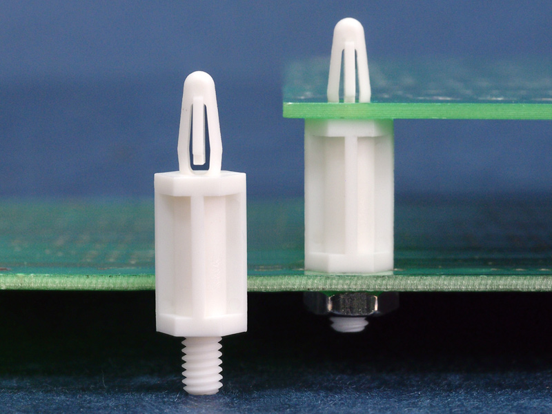 Male Threaded UNC 8-32 Hex Nylon 66 Bayonet Snap Lock spacer. Designed to fit a Metric UNC 8-32 Chassishole. Top hole dia. Ø4.0mm. Thickness 1.6mm. Standoff height is 12.7mm