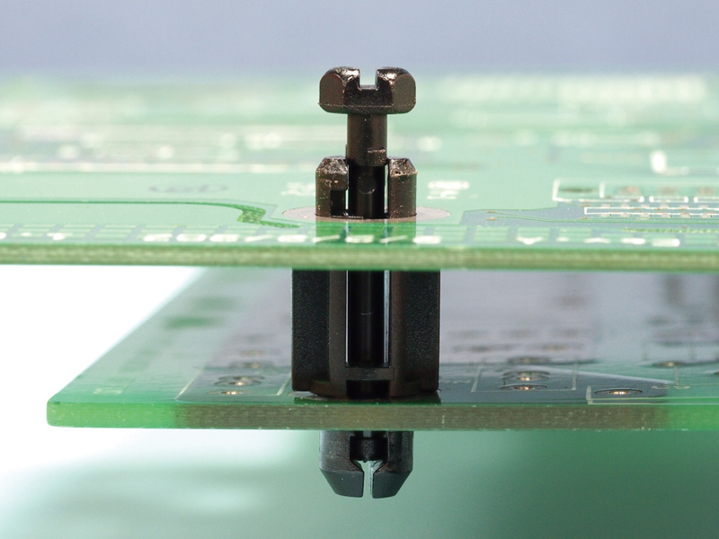 Spacer Snap Lock with Lock Pin. Height 4.8mm. Chassis dia. Ø6.3-6.4mm. Thickness 1.4-2.4mm. 2 part system. Pin locks spacer in place