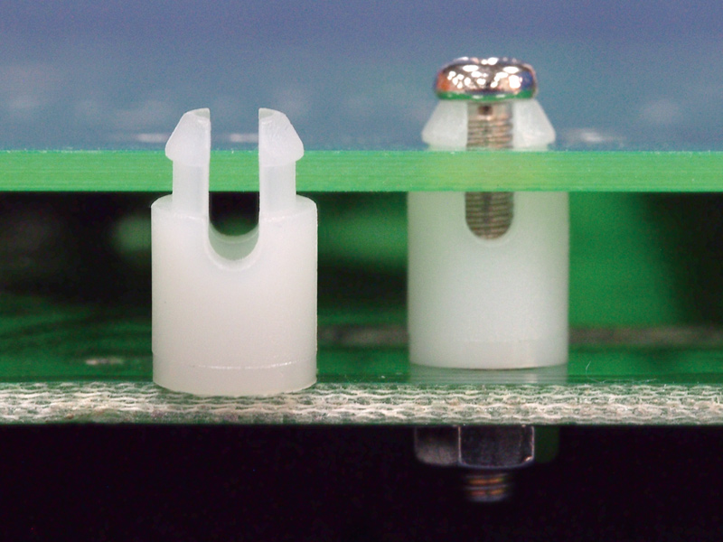 Self retaining spacers are used to insulate the heads of screws on a printed circuit board, while providing the desired spacing between the chassis and the PCB. Standoff height is 25.4 mm.
