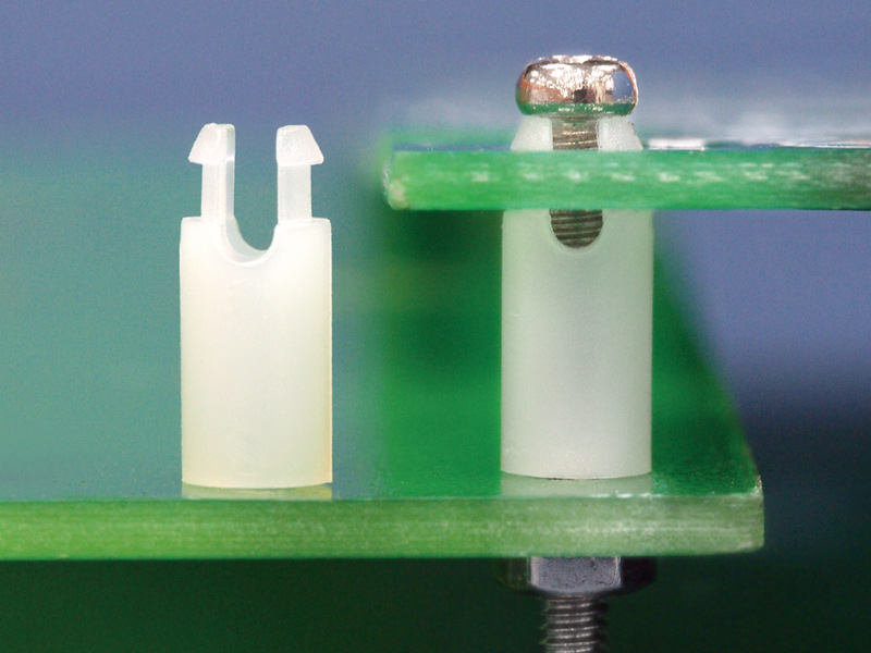 Self retaining spacers are used to insulate the heads of screws on a printed circuit board, while providing the desired spacing between the chassis and the PCB. Standoff height is 7 mm.