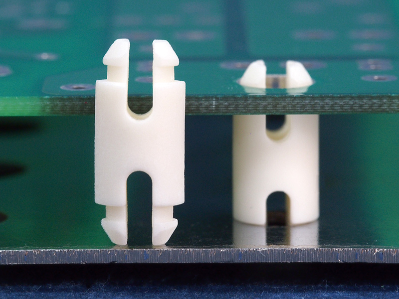 Dual locking support post. A two prong snap lock fits a top and bottom hole of 5.2 mm. Standoff height is 9.6 mm.