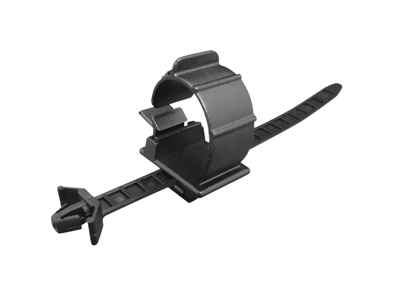 Round adjustable Lock Wire Clip with slider mechanism for securing an IEC AC power connector to a Chassis Push-Mount strap. Material Nylon 66. Color Black. Prevents accidental disconnection of the cord