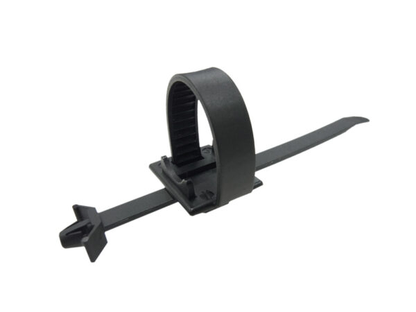Tension Lock Wire Clip with slider mechanism for securing an IEC AC power connector to a Chassis Push Mount strap. Material Nylon 66. Color Black. Prevents accidental disconnection of the cord