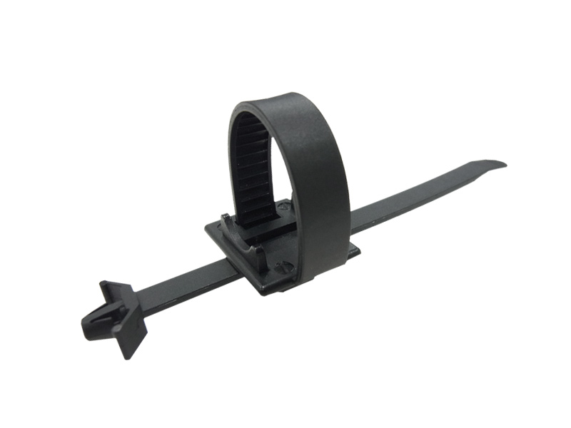 Adjustable Strap Holder with slider mechanism for securing an IEC AC power connector to a Chassis Rear Mount strap. Material Nylon 66. Color Black. Prevents accidental disconnection of the cord