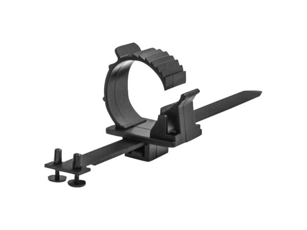 Round adjustable Lock Wire Clip with slider mechanism for securing an IEC AC power connector to a Chassis Dual Rivet Mount strap. Material Nylon 66. Color Black. Prevents accidental disconnection of the cord