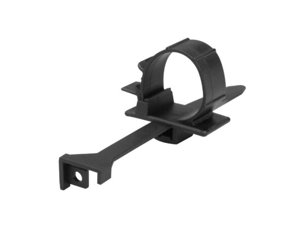 Round Adjustable Lock Wire Clip with slider mechanism for securing an IEC AC power connector to a Chassis Rear Mount strap. Material Nylon 66. Color Black. Prevents accidental disconnection of the cord