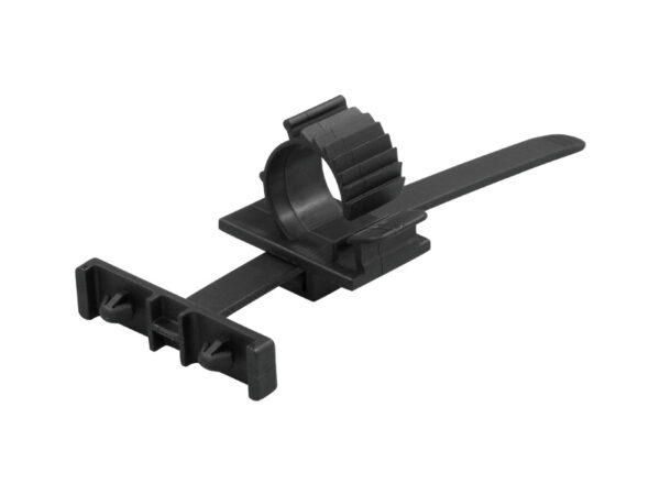 Round Adjustable Lock Wire Clip with slider mechanism for securing an IEC AC power connector to a Chassis Dual Push Mount strap. Material Nylon 66. Color Black. Prevents accidental disconnection of the cord