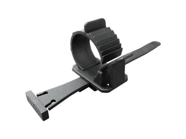Round Adjustable Lock Wire Clip with slider mechanism for securing an IEC AC power connector to a Chassis Rear Mount strap. Material Nylon 66. Color Black. Prevents accidental disconnection of the cord