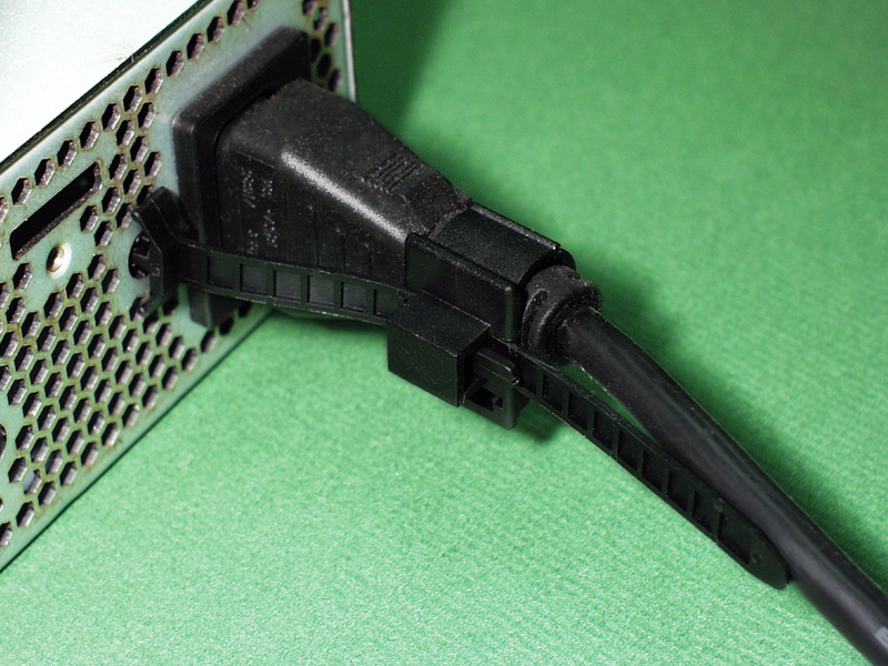 Round adjustable Lock Wire Clip with slider mechanism for securing an IEC AC power connector to a Chassis Push-Mount strap. Material Nylon 66. Color Black. Prevents accidental disconnection of the cord