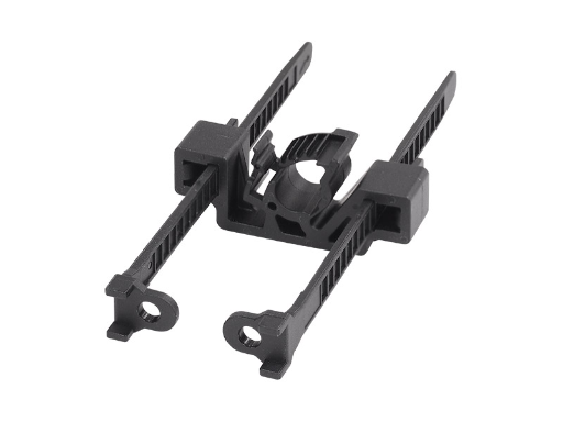 Round adjustable Lock Wire Clip with slider mechanism for securing an IEC AC power connector to a Chassis Screw Dual Secured strap. Material Nylon 66. Color Black. Prevents accidental disconnection of the cord