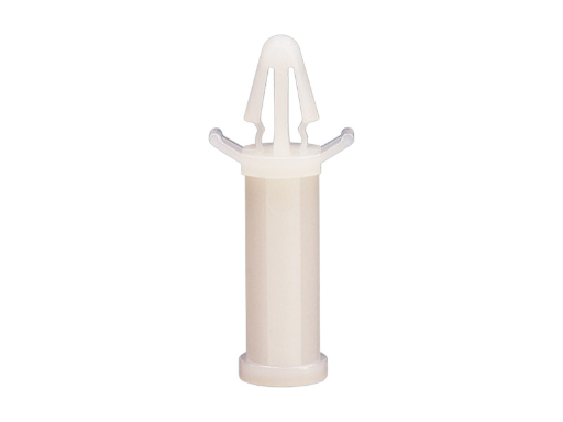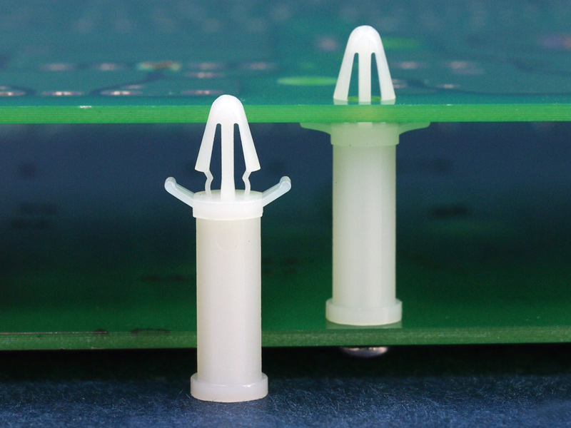 Snap fit spacer with tension wing for a 4 mm panel hole equipped at the chassis side with a pilot hole of 2.6 mm for an M3 self tapping screw. Standoff height is 18.2 mm.