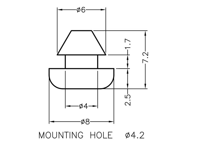 Push In Rubber Foot. Hole Ø4.0mm Panel Thickness 1.7mm Surface Ø8mm.The push-in design enables tool-free, quick installation for both temporary and permanent use.