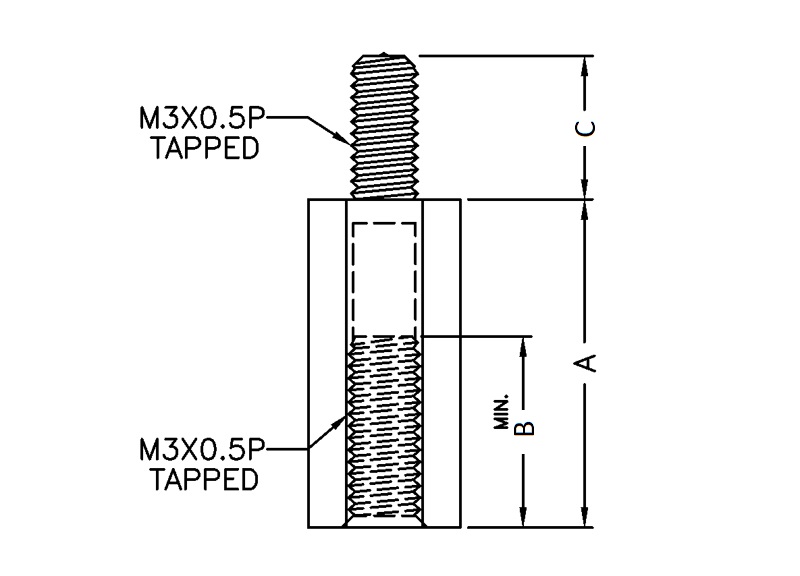 | Part no. | Material | Color | A Length | B Tap Depth | C Tap Length | D Hex Size | Package |