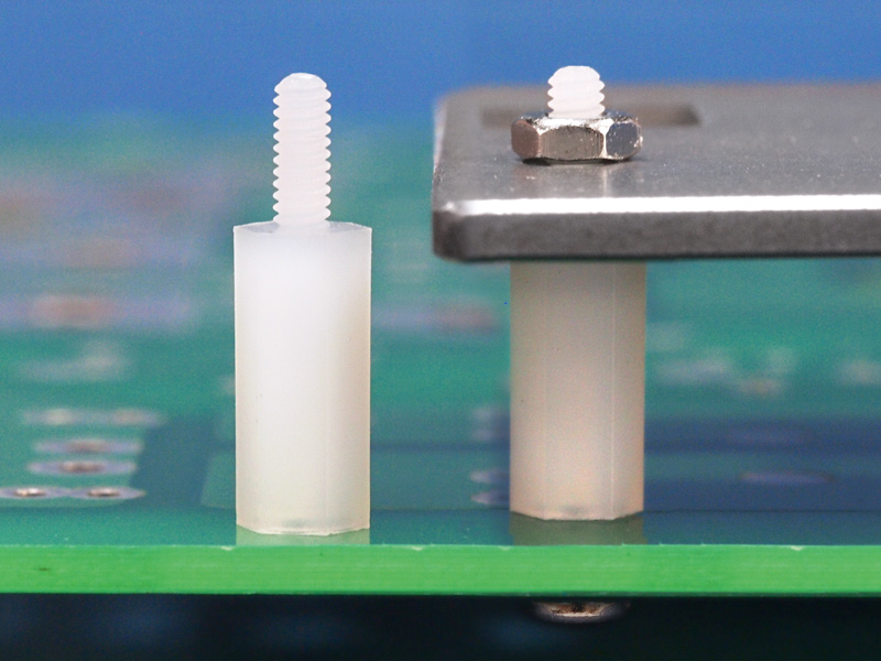 M2 metric hexagonal nylon spacer; Male/Female. Spacer body length is 14 mm.