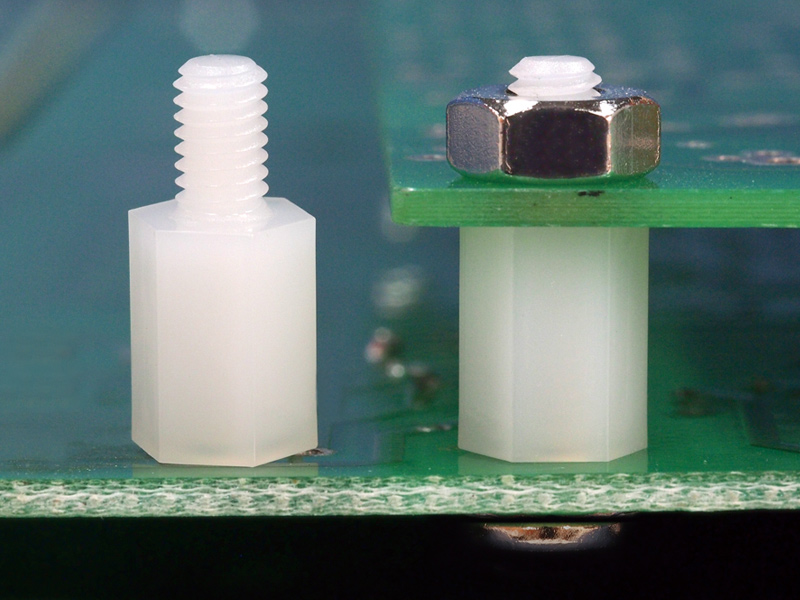 M4 hexagonal nylon spacer; male/female. Spacer body length is 14 mm.