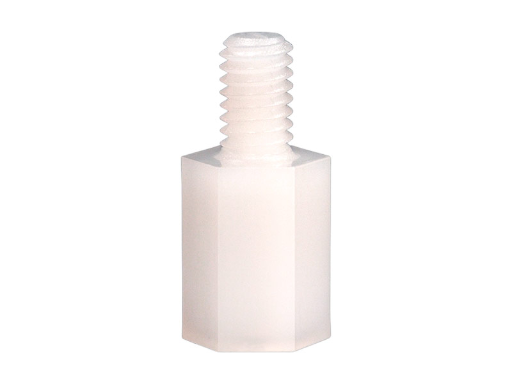 M4 hexagonal nylon spacer; male/female. Spacer body length is 8 mm.