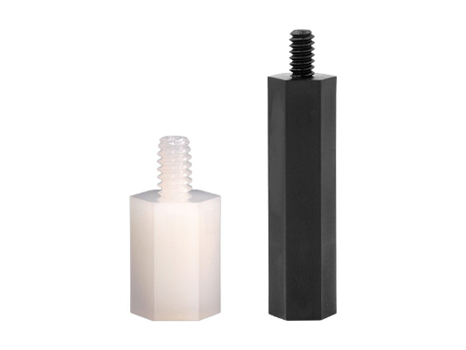 UNC 4-40 hexagonal nylon spacer; male/female. Spacer body length is 28.7 mm.