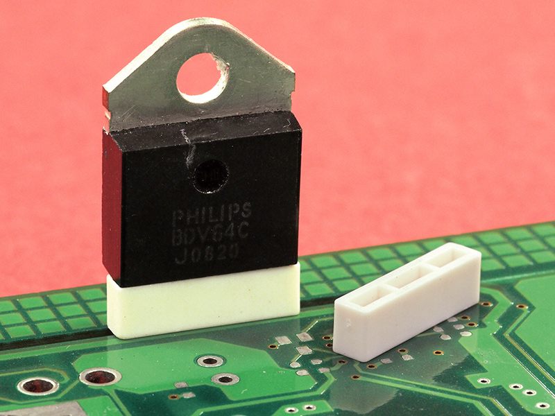 Rectangular Spacer for TO-247 packaged power electronic components. Height 4.5mm. Material PBT (UL). Color Black. This housing is ideal for insulating and protecting the lead wires of power transistors.