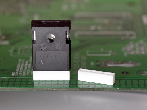 Rectangular Spacer for power electronic components. Height 4.3mm. Material Nylon 66. Color Natural/Black. This housing is ideal for insulating and protecting the lead wires of power transistors.