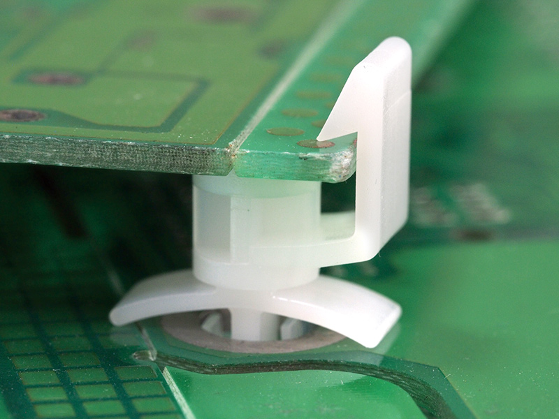 Spacer Edge Flat Rest Snap Fit arrowhead with tension wings. Nylon 66. Color Natural/Black. Snap Fit hole dia. Ø4.8mm. Thickness 0.8-2.0mm. Spacer Length 12.7mm