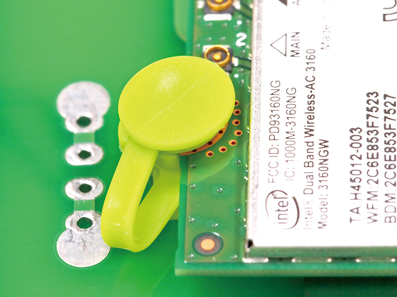 M.2 (NGFF) board Spacer Snap In Mounting Retention Clip . Height 4.0mm. Mounting Hole Thickness 1.6-1.8mm. Material Nylon 66. Color Natural/Black/Green/Blue. A vertical push-to-lock/unlock design firmly secures the M.2 card for reliable mechanical stability.