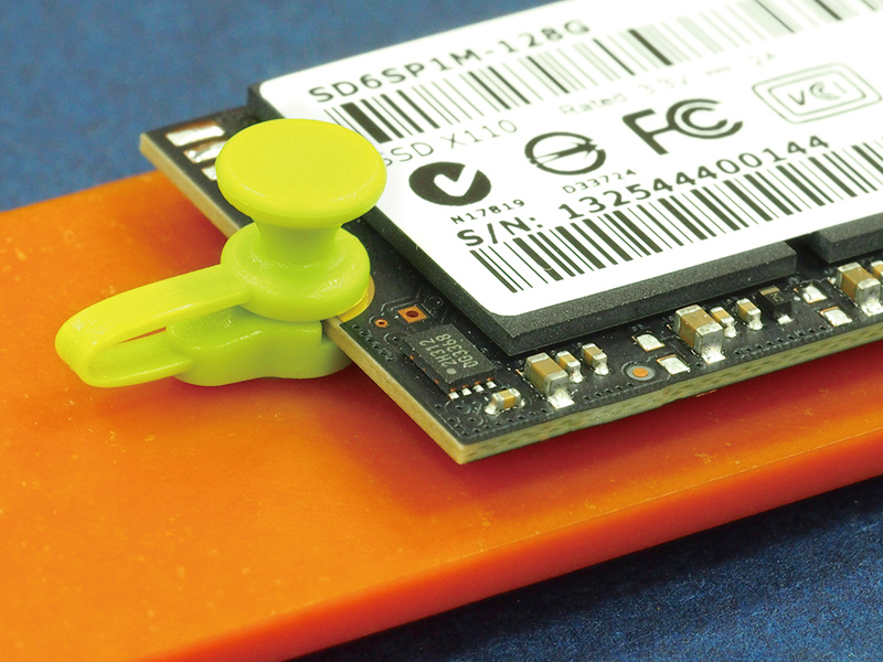 M.2 (NGFF) board Spacer Snap In Mounting Retention Clip . Height 2.08mm. Mounting Hole Thickness 2.0mm. Material Nylon 66. Color Natural/Black/Green/Blue. A vertical push-to-lock/unlock design firmly secures the M.2 card for reliable mechanical stability.