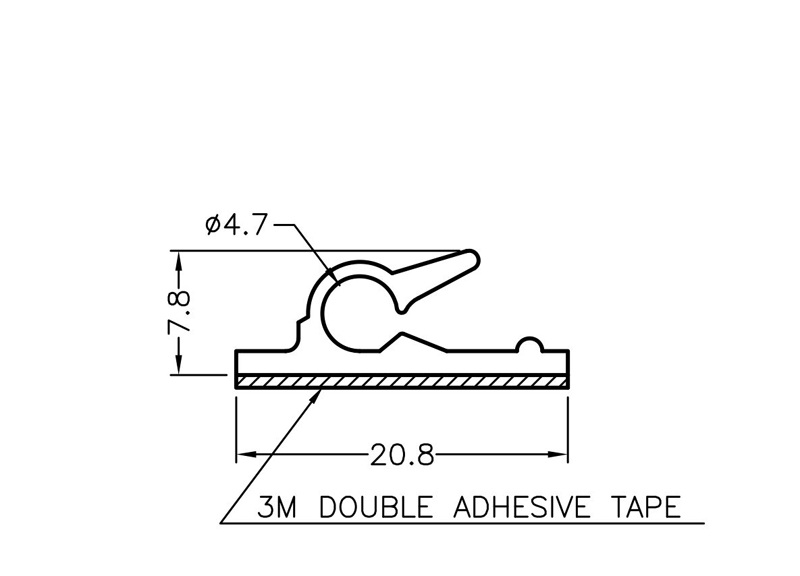 Adhesive Mount 20.8×13.0mm Round Wire Clip Side Entry. Holding dia. Ø4.7mm. Material Nylon 66. Available in Natural or Black